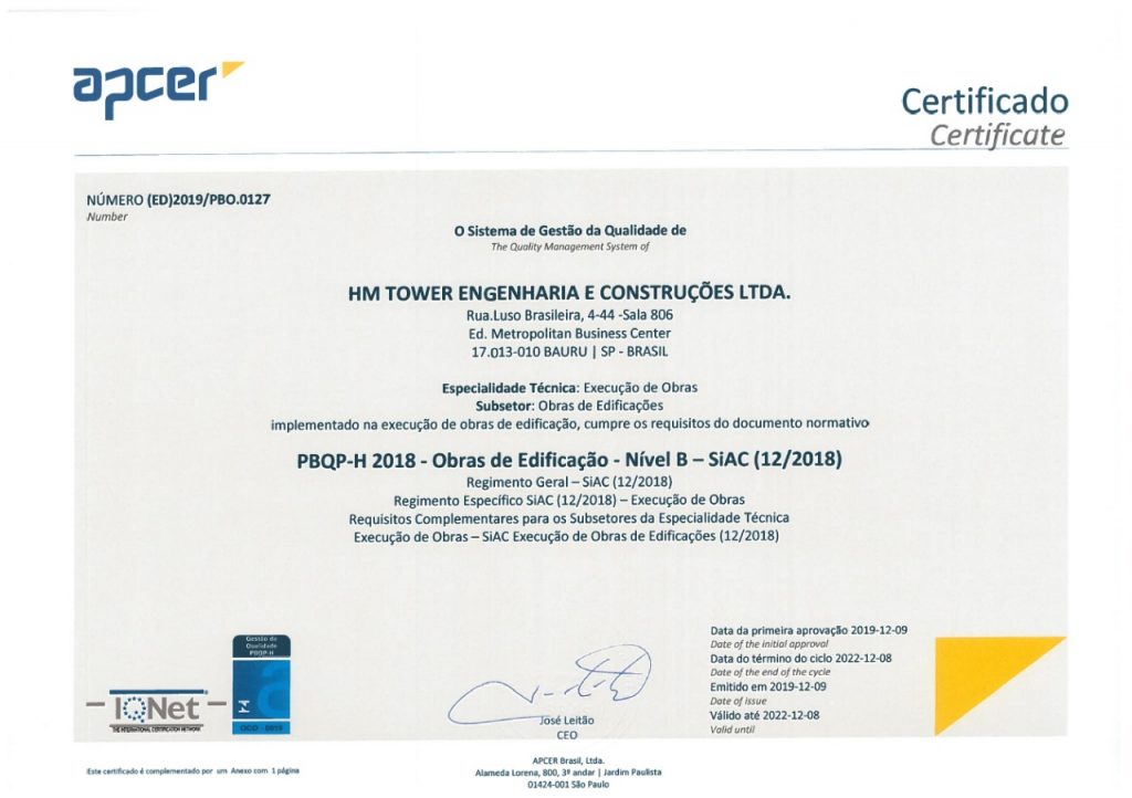 Hoje a HM Tower recebe o certificado PBQP-H 2018 através da certificadora Apcer Brasil.
